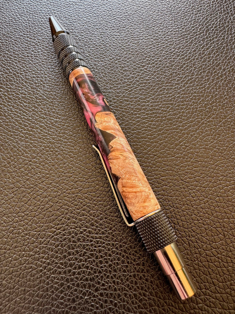 This Everyday Carry click pen is made of aluminum, wood, and resin and is well balanced. The metal grip makes it feel sturdy but lightweight. It was handmade on the lathe.